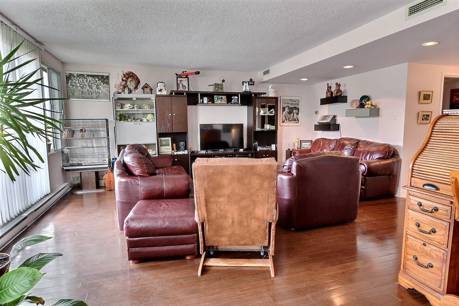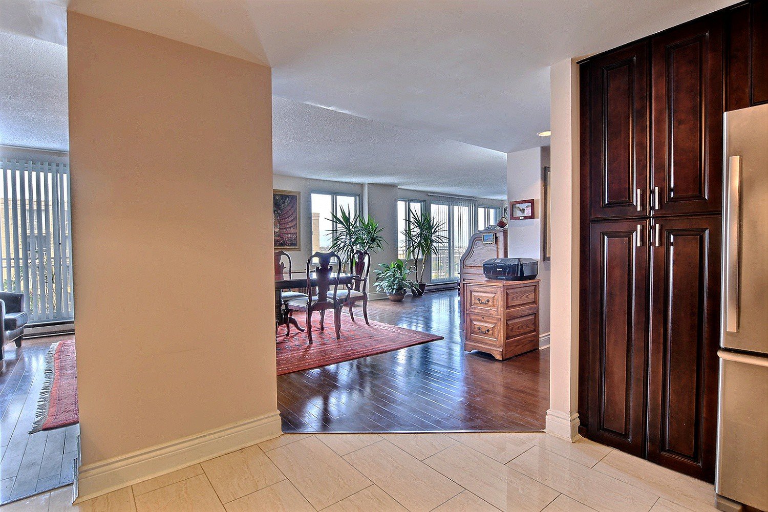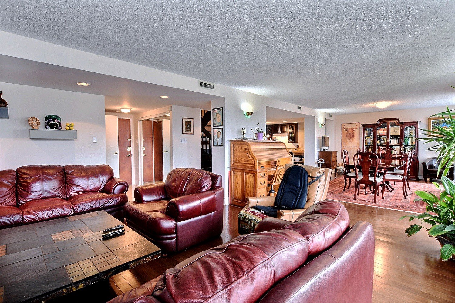 Spacious condo on two floors offering a large reception , 3 bedrooms two full bathrooms , a powder room, 2 indoor garages, heated pool, gym, close to Cote -Vertu mall, very well maintained building